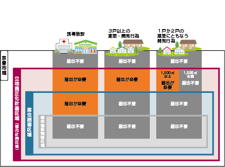 コンパクトで暮らしやすいまちづくりを目指して「立地適正化計画に基づく建築等の届出制度」 最終更新日:2025年5月1日 (ID:1979) 印刷 市では、平成30年4月に、都市再生特別措置法に基づく「宗像市立地適正化計画」(以下「計画」)を策定し、令和7年5月に改定を行いました。 計画に合わせて、法律に基づきこれらのエリア外での一定の開発行為などを対象とした「建築等の届出制度」を運用しています。 届出制度により、以下の場合は、行為に着手する日の30日前までに市への届出が必要となります。 届出が必要な場合居住誘導区域外で次の行為をする場合3戸以上の住宅の建築目的で開発行為をする1戸か2戸の住宅の建築目的で1,000平方メートル以上の規模で開発行為をする3戸以上の住宅を新築する建築物を改築か用途変更して3戸以上の住宅とする都市機能誘導区域外で次の行為をする場合誘導施設(注1)を有する建築物の建築目的で開発行為をする誘導施設を有する建築物を新築する建築物を改築や用途変更して、誘導施設を有する建築物とする都市機能誘導区域内で次の行為をする場合誘導施設(注1)を休止又は廃止する お知らせ(PDF:133.8キロバイト) (注1)都市機能誘導区域(JRの駅や市役所周辺などの拠点等)に維持・誘導を図る施設。ただし区域によって誘導施設が異なるため、詳しくはお問合せください。 1.床面積が3,000平方メートルを超える商業施設 2.病院のうち、内科または外科を有するもの 3.窓口のある銀行その他これらに類するもの 4.学校教育法に基づく学校(幼稚園、市立学校は除く)、体育館、文化ホールなど教育・文化施設 5.その他計画に定める施設届出の時期行為に着手する30日前まで届出先都市計画課/窓口(市役所本館2階)居住誘導区域・都市機能誘導区域の調べ方住所や地番を指定して誘導区域等の都市計画情報を検索できます。宗像市都市計画情報サービス 下記は区域全体を把握する際にご使用ください。 【位置図】立地適正化計画の誘導区域境界一覧(PDF:26.41メガバイト) 立地適正化計画の届出の手引き[届出の手引き(手引き内にPDF形式の届出様式があります)] 【届出手引】立地適正化計画の届出手引き(PDF:1.52メガバイト) 計画の本編・様式等リンク先はこちら[計画本編]宗像市立地適正化計画(令和7年5月改定)[届出様式](2部提出) 様式第10(開発行為届出書)(ワード:18.2キロバイト) 様式第11(住宅等を新築し、又は建築物を改築し、若しくはその用途を変更して住宅等とする行為の届出書)(WORD:24KB)(ワード:21.8キロバイト) 様式第12(行為の変更届出書)(WORD:20KB)(ワード:17.6キロバイト) 様式第18(開発行為届出書)(WORD:21KB)(ワード:18キロバイト) 様式第19(誘導施設を有する建築物を新築し、又は建築物を改築し、若しくはその用途を変更して誘導施設を有する建築物とする行為の届出書)(ワード:21.8キロバイト) 様式第20(行為の変更届出書)(WORD:21KB)(ワード:17.7キロバイト) 様式第21(誘導施設の休廃止届出書)(ワード:14.4キロバイト) 様式第10(開発行為届出書)( ワード:18.2キロバイト) 様式第11(住宅等を新築し、又は建築物を改築し、若しくはその用途を変更して住宅等とする行為の届出書)( ワード:21.8キロバイト) 様式第12(行為の変更届出書)(WORD:20KB)( ワード:17.6キロバイト) 様式第18(開発行為届出書)( ワード:18キロバイト) 様式第19(誘導施設を有する建築物を新築し、又は建築物を改築し、若しくはその用途を変更して誘導施設を有する建築物とする行為の届出書)( ワード:21.8キロバイト) 様式第20(行為の変更届出書)( ワード:17.7キロバイト) 様式第21(誘導施設の休廃止届出書)( ワード:14.4キロバイト)