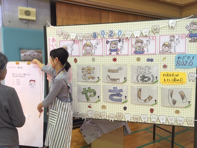 宗像歯科医師会主催「宗像めざせ!8020」に行こう!〜12月4日レポート〜 最終更新日:2019年12月4日 (ID:2642) 印刷 「80歳で20本以上の歯を保とう」という8020運動。 11月9日、メイトム宗像で「第23回宗像めざせ!8020」が開催され、たくさんの親子が参加していました。11月7日・11月8日は「いいな、いい歯。」の日なので、毎年この前後の土曜日に開催しています。 正しい磨き方を学べる「ブラッシング指導」歯垢を赤く着色する液体でくちゅくちゅした後、赤く着色した歯垢をチェックしながら色が落ちるまでブラッシング。みがき残しが見えることで子どもにも分かりやすいブラッシング指導をしてもらえます。噛む力をチェックできるガムや、唾液検査で歯周病のチェックも出来ました。 受付でもらった歯ブラシを使います 液体で赤くなった歯垢を磨いてみよう 力を抜いて優しくて磨いて、とアドバイスされていました 無料の歯科検診では泣いている子もいました。治療じゃないから痛くないよー。お子さんを連れた親御さんも歯科検診できます。小さな子どもがいると、親御さんの病院には行きにくいので、すごくいいですね! 楽しいクイズラリーや手型の石膏模型もありましたクイズラリーで歯の健康も学べます。某炭酸飲料500mℓには、角砂糖が約15個分入っているって!? 勉強になるなぁ。答え合わせをしたらお楽しみのくじ引きも出来ます。大人も歯ブラシと歯磨き粉をいただけました。嬉しい。 クイズラリーに挑戦! 答え合わせの後はハズレなしのくじ引き 欲しい景品がいっぱいです 私のおすすめは手型の石膏模型のプレゼントです。歯型を取る材料を使っているので、手の細部まで取れる!我が子が小さな頃のぷくぷくした手がかわいいんです。あの頃はかわいかった。(遠い目)手を開くのが難しい赤ちゃんは足形を取っていました。取り出す瞬間を見せてほしかったですが、石膏が固まるのに時間がかかるので、持ち帰ってから取り出すそうです。帰ってからのお楽しみですね。 手形石膏模型コーナー 手をピンクの型に押しつけます 石膏を入れてもらいました。取り出すのが楽しみ 宗像歯科医師会の赤間会長にお話を聞きました。「3歳以下のお子さんの虫歯は、近年では減ってきています。その一方で小学生でも歯石がついて歯肉炎になっているお子さんが見受けられ、歯周病の低年齢化が危惧されています。歯周病は歯周病菌が引き起こす病気ですが、歯石はその歯周病菌のすみかになってしまいます。最近では私たちも虫歯で歯を抜くよりも歯周病で歯を抜くことの方が多くなっています。歯周病予防には定期的に歯医者さんに通って歯石とりをされることが大切です」「噛むことで脳が活性化します。最近のお子さんはあまり噛まずに飲み込める柔らかい食事やおやつが多くなったせいか、顎の成長が不足している場合があります。このようなお子さんは永久歯に生え変わった時にスペースが足らずに歯並びが悪くなってしまう可能性もあります。ちゃんと噛むことで正常な顎の成長が期待できます」そんな思いからイベントの中では、栄養士会による「歯に良いおやつの展示・試食」コーナーがあるんですね。 歯に良い食べ物をわかりやすく教えてもらえます 試食と家でも作れるレシピももらえます ポスターコンクールもありました 丈夫で健康な歯や顎のために「まごはやさしい」食品を積極的に摂取するといいそうです。ま:豆類(大豆・あずき)ご:種実類(ごま・アーモンド)わ:海藻類(わかめ・のり)や:野菜類(根菜・青菜)さ:魚類(魚・貝)し:キノコ類(しいたけ・しめじ)い:芋類(じゃがいも・さつまいも)顎や歯が丈夫になり虫歯を予防するだけでなく、消化を良くして脳の働きを良くする。満腹中枢が働いて食べ過ぎを防ぐそうです。よし始めよう!(ここ重要!)参加して歯についての素朴な疑問を聞くことが出来ました。「かかりつけの歯医者」に定期的に通うことで、過去のデータや変化にも気づけること、歯石は体質でたまりやすい人がいることなど、大人の参加もOKなので子どもから大人までみんなで参加して健康を維持したいですね! レポーター庄野