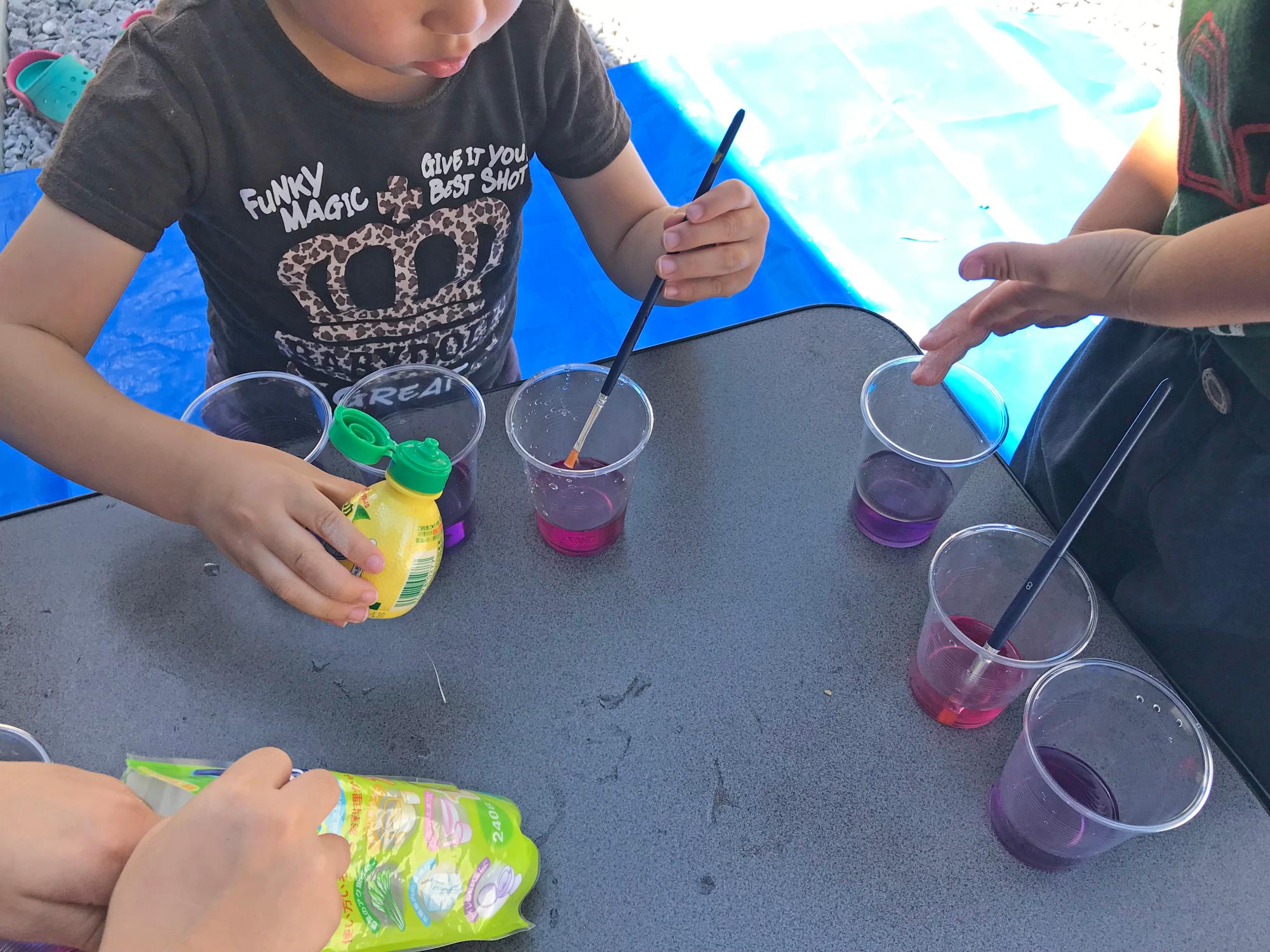 グリーンカーテンを作っておうち時間を楽しみました~9月30日レポート~ 最終更新日:2021年9月30日 (ID:2693) 印刷 こんにちは、ママレポーターの新田です。 昨年に引き続き外出自粛を求められた今年の夏休み、子どもたちとの家での過ごし方に頭を悩まされた皆さんも多かったのではないでしょうか。 我が家では、ゴールデンウィークから夏休みに向けておうち時間を子どもたちと楽しめるように、グリーンカーテンに初挑戦。時間はかかりますが、「育てる、観察する、遊ぶ、食べる」など長期間楽しむことができましたよ。 ゴーヤと朝顔、発芽からグリーンカーテンになるまで 今回は初心者向きのゴーヤと朝顔に挑戦。それぞれゴールデンウィーク中に種から育ててみました。 「ゴーヤ」は4月30日にスタート トレイの上に種を並べて室内で発芽させました。気温が低かったせいか、なかなか発芽せずやきもきしていましたが、1週間ほどで発芽し種はポットの中へ。その後、大きくなった2株を底の深い野菜用のプランターに植え替えます。 発芽から植え付けまで。大きいポットの方が苗もよく育ちました 「朝顔」は5月9日にスタート 小学校以来、久しぶりに育てる朝顔。こちらはプランターに種を直接まき、5日ほどで発芽しました。その後間引きして3株に減らします。 種まきから発芽まで。子どもたちと一緒に種まき ゴーヤ、朝顔とも本葉が5、6枚出てきたらその上で「摘心(てきしん・茎の先をカット)」。そうすることでわき芽の成長を促し、横から小ヅルがたくさん伸びてきます。 同じように小ヅルがある程度伸びた後、再び摘心すると孫ヅルが出てきてカーテンのようになっていきます。 せっかく伸びた茎をカットしてしまうのはなんだか可哀想ですが、小ヅルや孫ヅルに朝顔の花やゴーヤの実がたくさんつくことからも摘心は必須です。 「6月10日」摘心後の朝顔(左)とゴーヤ(右) 子どもたちも順番に水やりを手伝ってくれます 「6月中旬」ついに花が咲きました! 「6月」白い朝顔ばかりの謎!?ポイントは茎の色でした 6月下旬になると徐々に朝顔が咲き始めました。今回、種から育てたので何色の花が咲くかワクワクしていたのに、咲くのはなぜか白い花ばかり・・・調べたところ、なんと茎の色から咲く花の色が予測できることが分かりました。 間引きの際には目がいかなかったのですが、確かに3株中1株は紫色の茎で青紫の花が咲き、緑色の茎だった残り2株には白い花が咲いています。白の朝顔って珍しいですしお洒落な雰囲気ですが、子どもと色水遊びをする予定だったので、急遽赤い花の苗も追加しました。 それにしても自分が子どもの頃には考えもしなかった疑問や発見があって、大人の朝顔観察もなかなか面白い! 白、赤、青紫の朝顔の茎の比較。確かに茎の色が違います 「7月」ツルがグングン伸びてグリーンカーテンの完成! 7月に入り夏が近づいてくると、ゴーヤも朝顔もツルがグングン伸びていき、室内からでも目線の高さにツルが見えるようになりました。子どもたちは一日に何度も部屋の中からのぞいては、「〇色の朝顔が〇個咲いている」「ゴーヤが大きくなってきた」と報告してくれたり、時にはしばらく一緒に眺めたり皆で成長を見守ります。 「7月8日」ツルがネットの一番上まで到達! 「7月25日」後から別に植えた朝顔。赤と青紫のコントラストが綺麗です 「7月29日」グリーンカーテン、ほぼ完成です! 「朝顔」の色水でお絵描きや色水ジュース作りを楽しみました 朝顔の花が咲いたところで、お待ちかねの色水遊びをしました。摘んだ花と少量の水をチャック付きの袋に入れて揉むだけなので簡単に作れます。 色水でお絵描き。濃い色の花びらの方が書きやすいです 色水ジュースは元の色水を薄めるだけで作れます(飲めません!)。これだけでも十分楽しめましたが、理系の夫より「酸性のレモン汁やアルカリ性の重曹を入れてみたら?」との助言を受け、それぞれ入れてみるとあら不思議!青紫の色水がレモン汁で赤紫色に、重曹で青色に変わりました。 まるでイリュージョンのように変化する色水に子どもたちも大興奮!これは朝顔の花に含まれる「アントシアニン」という色素が酸性やアルカリ性の強さによって変化しているもので、小学校の理科で習うリトマス紙の性質と同じです。 他の身の回りの物でも色が変わるのか試してみるのも面白そうですね。 青紫色、赤色それぞれ花で作った色水にレモン汁、重曹をいれたもの。どれも綺麗な色です 酸性とアルカリ性を混ぜると炭酸ジュースの出来上がり! ジュースの開発に励んだ夏休みはレモン汁と重曹をたくさん消費しました(笑) 酸性とアルカリ性を混ぜる際は、発泡して吹きこぼれないよう、入れすぎに注意! その後、子どもたちは「実験!実験!」「ジュース作ろう!」とウキウキした様子で色水を混ぜたりレモン汁を足したりしながらお気に入りの一杯を開発。長い期間をかけて少しずつ咲いた朝顔のおかげで、夏休み中は何度もジュー