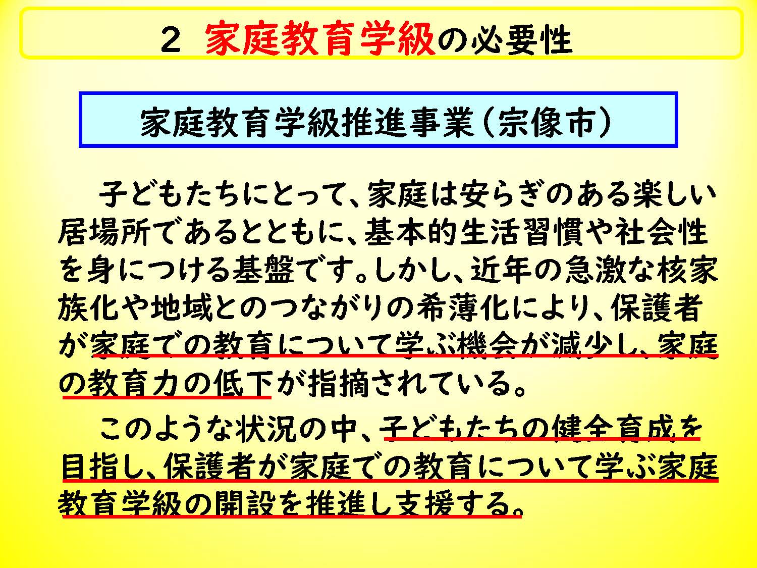 家庭教育のすすめ「家庭教育学級」に参加しよう!~8月12日レポート~ 最終更新日:2023年8月12日 (ID:2780) 印刷 こんにちは、くすくすママレポーターです。 みなさん、「家庭教育学級」という言葉を知っていますか?市内の保育所や市立学校の保護者の方であれば、一度は耳にしたことがあるかもしれません。 令和5年5月19日には、新たに家庭教育学級の開設を考える人向けに、宗像市教育委員会が「令和5年度家庭教育学級開設説明会」を開催。私も我が子の通う小学校PTAの成人教育委員になったこともあり、説明会に参加して「家庭教育」の現状と大切さを、学んできました! 家庭教育学級とは? 「家庭教育学級」は、子どもたちの健全育成につなげるため、市の事業として取り組んでいます。家庭は子どもたちにとって安らぎのある楽しい居場所であり、基本的な生活習慣や社会性を身につける場所です。しかし、近年は核家族化や地域とのつながりの衰退により、保護者が家庭での教育について学ぶ機会が減少し、家庭の教育力の低下が指摘されています。そんな時に、保護者が家庭での教育について学ぶことができるのが「家庭教育学級」です。市内保育施設保護者会や市立学校PTA、コミュニティ運営協議会、子育て支援団体らが講座形式で開設。保護者以外の一般の方も参加することができます。令和5年度は、「子どもの発達支援」「子どもの権利」「親子関係」「生命の尊重」「社会的マナー」「メディアに関すること」「食育」「生活習慣」「親子のふれ合い遊び」の9つのテーマを用意。過去には、「食育」をテーマに身近な食材で体に優しいお菓子を親子で作るものや、「生命の尊重」をテーマに火傷や怪我などをした時の応急処置を学ぶ講座が開設されました。 9つのテーマ以外の講座も開設可能。詳しくは「家庭教育学級」ページをご覧ください 資料の表紙 保護者が家庭教育について学ぶことができます 説明会の様子。当日は27人が参加しました 資料は、「福岡県青少年健全育成総合計画」の「福岡県の青少年の現状」でも紹介されています(福岡県HP) 家庭教育学級の必要性 コロナ禍で家庭の在り方・過ごし方は大きく変化しました。またデジタル化が加速したことで、子どもたちを取り巻く環境も急激に変化しています。 青少年の健全育成のために必要な取組 県では、3年毎に青少年の健全育成に関する意識調査が行われていて、回答された方もいるかもれません。青少年の健全育成のために必要な取組として、多くの保護者は「家庭でのしつけや、教育の充実が必要である」と考えています。 近所の人との人間関係が希薄化しています 近所の人との関わりについての調査結果をグラフで見てみると、年齢が上がるにつれて、あいさつをする子どもの割合が減っているようです。近所の子どもが悪いことをしても、叱らない大人が増えているという傾向が見られます。 知らないと怖いスマホの実態 子どものスマートフォン所持・利用時間について 次は、気になる「子どものスマートフォン所持」についてのデータです。これは令和2年度の調査なので、今はもっと多いでしょうね。 学校以外でのインターネット利用、利用するようになってからの変化について 情報化社会の進展により、メールやSNS等でコミュニュケーションを取ったり、動画サイトで動画を観ることで楽しみが増え、生活が豊かになりました。一方で、睡眠、読書、学習などの時間が減ってしまったことは否めません。 スマートフォンのフィルタリング使用状況 インターネット上には、違法・有害な情報が氾濫し、昨今は犯罪等も増えているそう。スマートフォンのフィルタリングの使用状況も5割以下。少し心配ですね。 コロナ禍の影響で変化した子どもたちの現状 学校が休みの日に何をする? そして1番びっくりしたのが、コロナ禍における子どもたちの遊びの変化です。公園や外でお友達と遊ぶより、1人自宅で過ごす子どもたちが増えているんですね。コロナ禍で、休日にお家時間を過ごす習慣ができた背景もありますが、子どもの成長には、家庭での生活も健やかであることが重要です。「子どもとしっかり向き合い、言葉に耳を傾けているか?」私も振り返ってみようと思いました。 子どもの将来の夢や、学校・地域行事への意欲について 子どもたちは、コロナ禍でたくさん楽しみを奪われてきました。その影響か、コロナ前後で将来の目標や学校生活、地域行事への意欲が減少している結果に。しかし子どもたちは、将来への不安や孤独を抱えながらも、学校生活を楽しみ、毎日成長しています。 不登校児童生徒の推移から分かる不登校の実態 我が家でも、身近な子どもや我が子の友達が、学校に行けなくなってしまった話を聞くことが増えたと感じていましたが、平成28年度から約4年で2倍に増えたことには驚きました。確実に増え続けています。 心がザワザワしたら、家庭教育学級に参加しよう! 不登校の増加は決して他所の話ではなく、