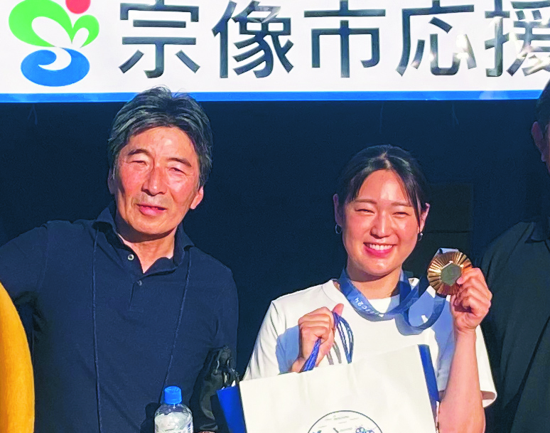 パリ2024オリンピック競技大会 福島史帆実さんが団体戦で銅メダル 最終更新日:2024年9月24日 (ID:7470) 印刷 8月11日に閉会したパリ2024オリンピック競技大会。宗像ゆかりの選手たちの試合結果について報告します。みなさん応援ありがとうございました。オリンピックでの結果宗像市出身の選手福島史帆実 選手/フェンシング女子サーブル個人:2回戦敗退/フェンシング女子サーブル団体:3位 銅メダル獲得竹原秀一 選手/競泳男子200m背泳ぎ:準決勝敗退(全体15位)宗像市ゆかりの選手(ブルガリア選手)マーク・フリストフ 選手/柔道 男子73kg級:2回戦敗退イヴァイロ・イヴァノフ 選手/柔道 男子90kg級:2回戦敗退フェンシング女子サーブル団体で銅メダルを獲得した城山中学校出身の福島選手が、9月1日にベスト電器スタジアム(博多区)で行われたアビスパ福岡宗像市応援デーに駆け付けてくれました。当日は銅メダルを持参し、市民や多くのみなさんへオリンピックの報告をしてくれました。メダルを持って笑顔の福島さん (右) と河野副市長