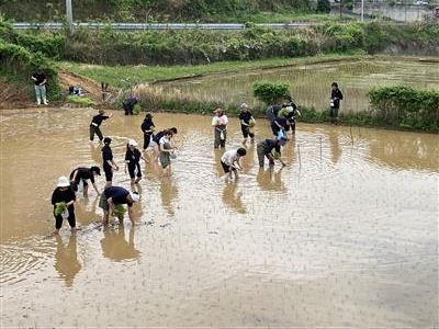 COP米作りチャレンジに参加 最終更新日:2025年5月2日 (ID:8255) 印刷 大島学園では、教育活動を支えてくださる方々のことを「Team 大島伴走者」とよんでいます。もずく採りや魚びらき、塩づくりや海藻アートなどなど、大島学園の特徴ある教育活動は「Team 大島伴走者」の協力により充実した活動を展開することができるようになりました。「COP」とは、大島地域を活性化するために島内外から集まってきた方々のことです。「team 大島伴走者」として、いつも子どもたちをあたたかく見守り支えてくださっています。また、甘夏ゼリーの開発や甘夏畑がもつ課題を解決しようと実践したり、大島に様々な人を呼び込んで「繋がり」をつくったりしています。今回は「COP」の新しいチャレンジ「米作り」に大島学園の子どもたちや職員が参加させていただきました。しばらく休田していた土地が、「COP」のメンバーでもある林田産業さんの「竹肥姫」とカナディアンキャンプの馬糞を混ぜて耕すことで美しい田んぼに復活しました。田んぼは大島学園のすぐ隣りです。田植えから収穫まで、子どもたちにとって、米作りの過程を間近に見ることができる大変贅沢な環境が整いました。稲刈りは8月半ば。稲の成長がとても楽しみです。