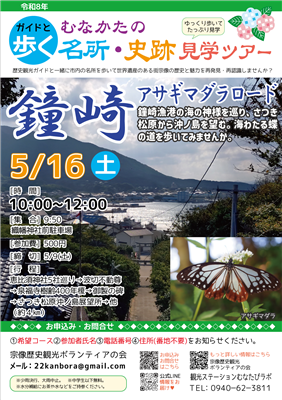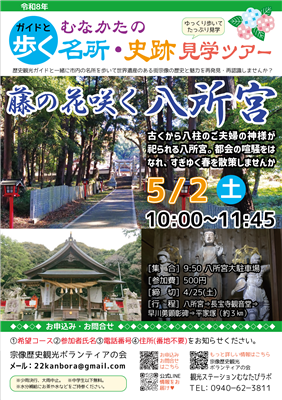 ガイドと歩くむなかたの名所&史跡見学ツアー 最終更新日:2026年3月27日 (ID:8333) 印刷 歴史観光ガイドと一緒にゆっくり歩いて、世界遺産のある街・宗像の歴史と魅力を再発見しませんか?今回は2コースご案内します。1・藤の花咲く八所宮古くから八柱のご夫婦の神様が祀られる八所宮。都会の喧騒をはなれ、すぎゆく春を散策しませんか。八所宮八所宮参道八所宮チラシ 開催日時・日時:令和8年5月2日(土曜日)10:00~11:45・集合時間:9時50分・集合場所:八所宮大駐車場 (〒811-4153宗像市吉留3186) 参加費500円※中学生以下無料 (保護者同伴必要)行程八所宮⇒長宝寺観音堂⇒早川勇顕彰碑⇒平家塚(約3km)申込締切令和8年4月25日(土曜日)2・鐘崎~アサギマダラロード鐘崎漁港の海の神様を巡り、さつき松原から沖ノ島を望む。海わたる蝶の道を歩いてみませんか。鐘崎漁港アサギマダラ鐘崎チラシ 開催日時・日時:令和8年5月16日(土曜日)10:00~12:00・集合時間:9時50分・集合場所:織幡神社前駐車場 (〒811-3512福岡県宗像市鐘崎岬224)参加費500円※中学生以下無料 (保護者同伴必要)行程恵比寿神社5社巡り→波切不動尊→泉福寺樹齢400年榎→御製の碑→さつき松原沖ノ島展望所→他(約4km)申込締切令和8年5月9日(土曜日)申込方法(1・2共通)⑴希望コース ⑵参加者氏名 ⑶電話番号 ⑷住所(番地不要)を入力し、メール・お電話のいずれかにてお申込みくださいメール:22kanbora@gmail.com(宗像歴史観光ボランティアの会)電話:0940-62-3811(観光ステーションむなたびラボ