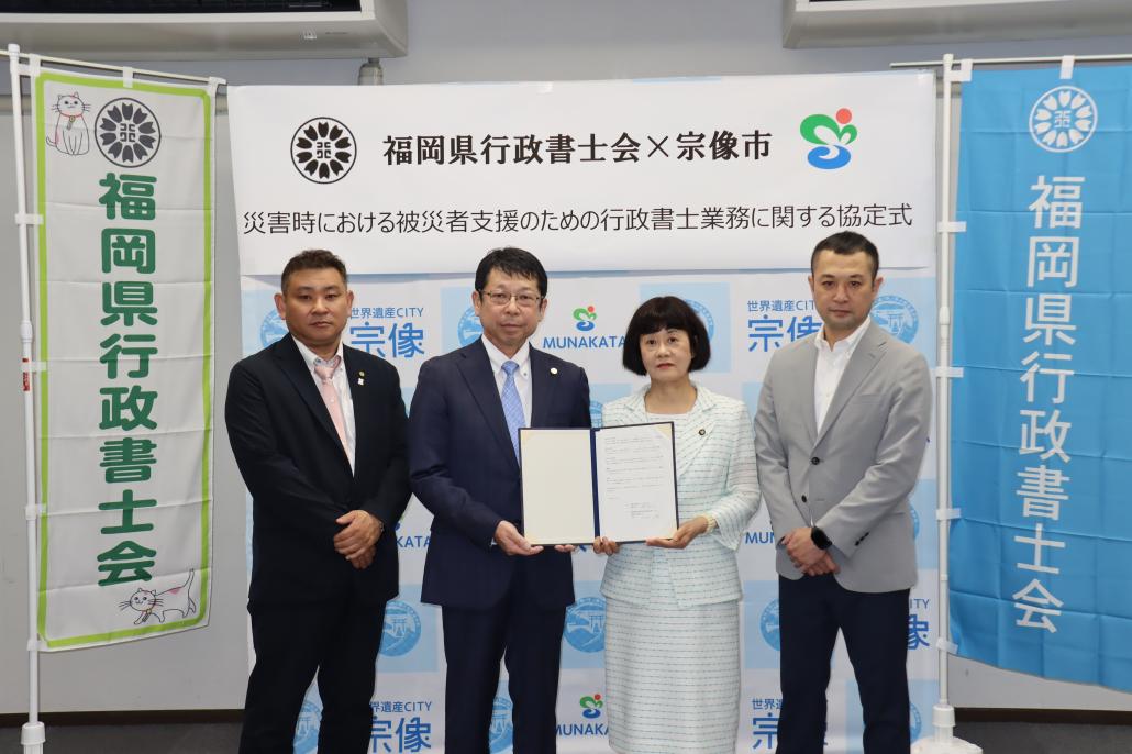 令和6年6月27日 災害発生時における被災者支援のための行政書士業務に関する協定 最終更新日:2025年2月11日 (ID:857) 印刷 近年、異常気象ともいえる集中豪雨などの災害が、全国各地で頻繁に災害が発生しています。宗像市では災害に備え、避難所の整備や防災用品の備蓄などの取り組みを行っていますが、災害発生後の生活再建の段階ではソフト面での支援も重要となります。これに備え、宗像市と福岡県行政書士会は「災害発生時における被災者支援のための行政書士業務に関する協定」を締結しました。今後も各関係機関と連携を図り防災・減災に取り組んでいきます。【行政書士の業務】行政書士とは、行政手続きに関する相談を受け、官公署への申請の代行や、許認可に関する公的書類の作成などの業務を行っています。本協定により、大規模な災害発生時には、行政書士による被災者支援相談センターを設置します。同センターでは、り災証明発行に関することや、行政の支援に関すること等、被災者の生活再建のために必要な手続きについて、無料で相談することができます。 協定書締結記者発表の様子協定書を手にする伊豆市長(右から2人目)、福岡県行政書士会 会長 田村 公隆様(左から2人目)と福岡県行政書士会 理事兼企画部長 川野 博満様(左)、福岡県行政書士会福岡北支部 支部長 木附 憲之様(右)