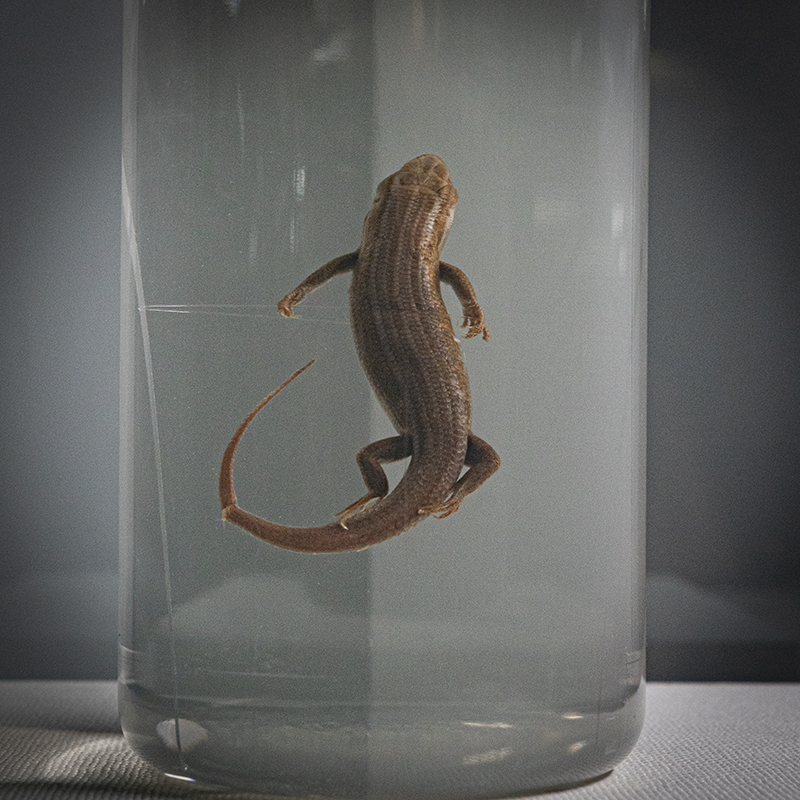 祈りの原風景 「沖ノ島の豊かな自然」展 最終更新日:2022年11月8日 (ID:3059) 印刷 祈りの原風景 「沖ノ島の豊かな自然」展 禁忌によって守られた 祈りの原風景 展示概要 意外と涼しい沖ノ島。 年平均湿度は80%と多湿。 謎のベールに包まれた沖ノ島の昆虫。 今後の調査に注目。 30種類の陸生貝類を確認。 沖ノ島固有種が見つかる可能性大。 島の爬虫類はニホントカゲだけ。 ヘビはいません。 哺乳類はクマネズミとドブネズミの2種。 オキノシマジネズミは絶滅か。 鳥たちは、沖ノ島と小屋島でのすみ分け。不思議ですね。 沖ノ島には絶滅危惧種の植物がたくさん 沖ノ島の原始林は、大正15年(1926)に国の天然記念物に指定されています。 100年後、今とは異なる生物が生息繁殖しているのか。 禁忌によって守られた祈りの原風景 自然崇拝の原点ともいえる島内の自然に焦点を当て展示海の道むなかた館では、世界遺産登録5周年と開館10周年を記念し「祈りの原風景『沖ノ島の豊かな自然』展」を12月28日まで開催。会期中は、特別展示室を中心に、島内で生息繁殖する動植物などの写真と映像、標本を展示。古代から続く祈りの原風景を作り出している島内の自然に焦点を当て紹介しています。そこで、この企画展を開催した海の道むなかた館の岡崇(おか・たかし)学芸員に話を聞いてきました。 展示概要 特別展示室は「『神宿る島』宗像・沖ノ島と関連遺産群」を動画で紹介する大型スクリーン(7m×18m)や宗像市内で発掘された遺物や民俗資料を展示する常設展示室の奥にあります。特別展示室では、時計周りに沖ノ島で生息繁殖する昆虫、貝類、爬虫類両生類、地質、哺乳類、鳥類、植物の順に紹介しています。また、エントランスホールから宗像市立図書館深田分館への連絡通路に9月現在鳥類の写真を展示しています。 まず、沖ノ島の自然環境、次いで、動植物について説明します。 特別展示室展示風景 自然環境(気候) 意外と涼しい沖ノ島。年平均湿度は80%と多湿。 沖ノ島は対馬海流の影響で、九州本土と比べ、温暖であるといわれていますが、2021年に沖ノ島祭祀遺跡内に設置したデータロガの計測では、最高気温27.5度、最低気温-2度でした。夏は30度を超えることはなく、九州本土よりむしろ涼しく、冬は、季節風の影響を直接受け、マイナスを記録することがわかりました。島内の湿度は、夏季はほぼ90%以上を記録し、100%を継続する日が数週間続きました。冬場は、1日の中で乾湿の振れ幅が大きいものの50%を下回る記録はほとんど見当たらず、年間の平均湿度は80%という多湿な環境でした。 自然環境(地質) 日本海の生い立ちを考える上で重要な地質。 沖ノ島の地質は、対州層群(注1)とその上に堆積した白色凝灰岩(はくしょくぎょうかいがん)(注2)の2種類から形成されています。対州層群は、沖ノ島の西側だけに地上に露出しています。 注 1=対州層群とは、沖ノ島から対馬にかけて見られる堆積層で日本海の生い立ちを考える上で重要な地質です。 注 2=白色凝灰岩とは、白色からやや緑がかった火山由来の堆積物です。 対州層群の岩質は、黒灰質の泥質で薄く堆積しています。このことから湖のような、流れのほとんどない穏やかな水辺で堆積したものと考えられています。この堆積層の断面が本の頁(ページ)のように見えることから頁岩(けつがん)と呼ばれています。 海底の泥や砂が波の跡を残し、化石となったものを漣痕化石(れんこんかせき)といいます。地殻変動で、海だったところが陸になり現れたものです。沖ノ島から西方に約75km離れた対馬にも同様の地層が見られます。対馬ではその地層から採取した石を材料とし対馬硯(つしますずり)が作られています。 沖ノ島の大部分と小屋島などの岩礁は、火山堆積物からなる白色の凝灰岩で形成されています。沖ノ島の古代祭祀の場は、この白色凝灰岩の巨石の転石が舞台となっています。島の北側でも凝灰岩の堆積の跡が見られます。また、小屋島ではスコリアと呼ばれる多孔質(たこうしつ)の火山礫(れき)の集積を観察することができます。 沖の島漁港の東側では、頁岩を含んだ凝灰岩が見られます。これは、マグマが噴出した際に、基底層である対州層群の頁岩を巻き込んで、凝灰岩として再び堆積したものと考えられます。 頁岩 沖ノ島の堆積層 昆虫 謎のベールに包まれた沖ノ島の昆虫。今後の調査に注目。 沖ノ島の昆虫類は、入島の制限に加え、季節によって出現する種類の変化や関心が高い分野に限定した調査が先行する傾向にあり、これまで、1年を通して島内をしらみつぶしに調べる調査は進んでいません。最も調査が進んだ種は、表面が堅いカミキリムシなどの甲虫目(こうちゅうもく)で、次いで多くの人が魅了されるチョウ目の研究です。まだまだ、謎のベールに包まれた分野です。 沖ツ津宮社殿前では6月の限られた期間だけヒメボタルが確認されています。ホタルは清流に生息するイメージですが、沖ノ島のホタルは陸生の貝類が分布する湿った場所に
